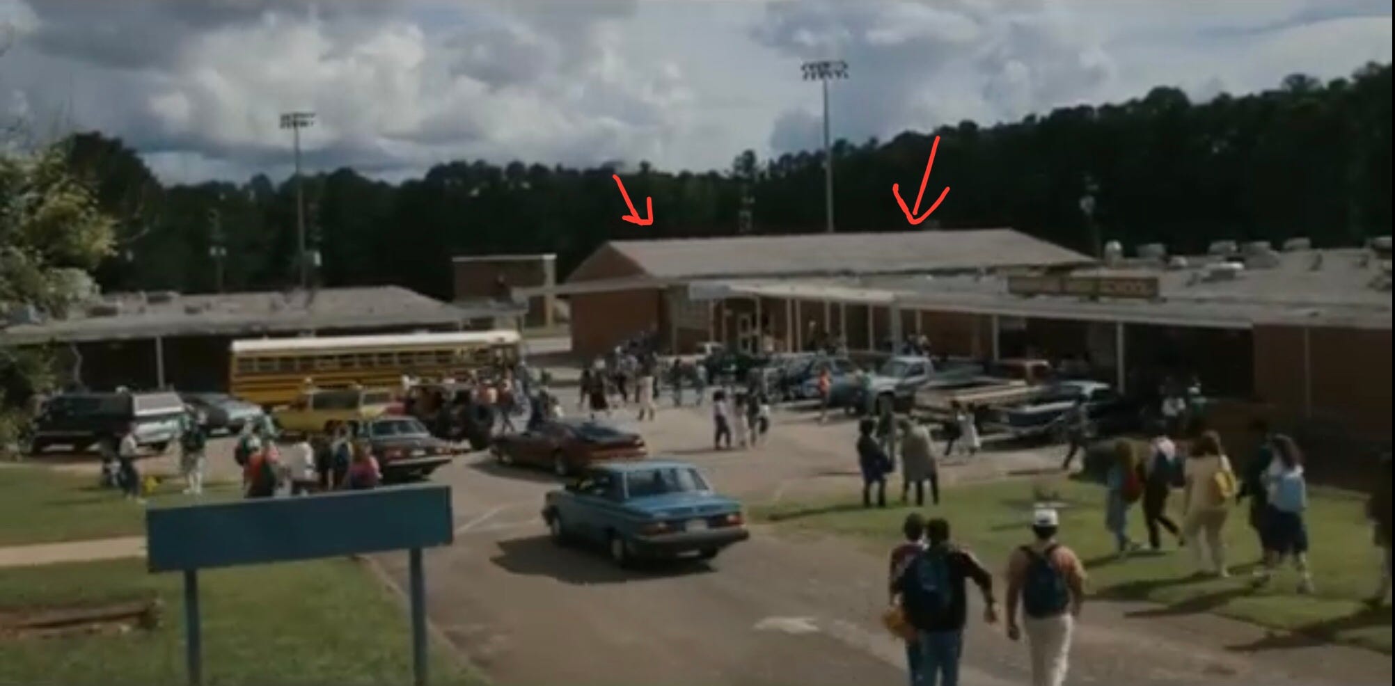 The first shot of the day was when Steve and Robin drive to school in episode 1, which you can see here at the 1:33 mark. I was in this building here. I’m pretty sure all I did was hold the door open for the group of kids walking out of the building and into the scene. I remember seeing Joe Keery chilling on his own in a corner of the building in between takes. I thought about saying something to him but I ended up leaving him alone. Again, I knew vaguely who he was but I didn’t want to out myself and say something dumb, and I also just wanted to leave him alone cause he obviously wanted space.