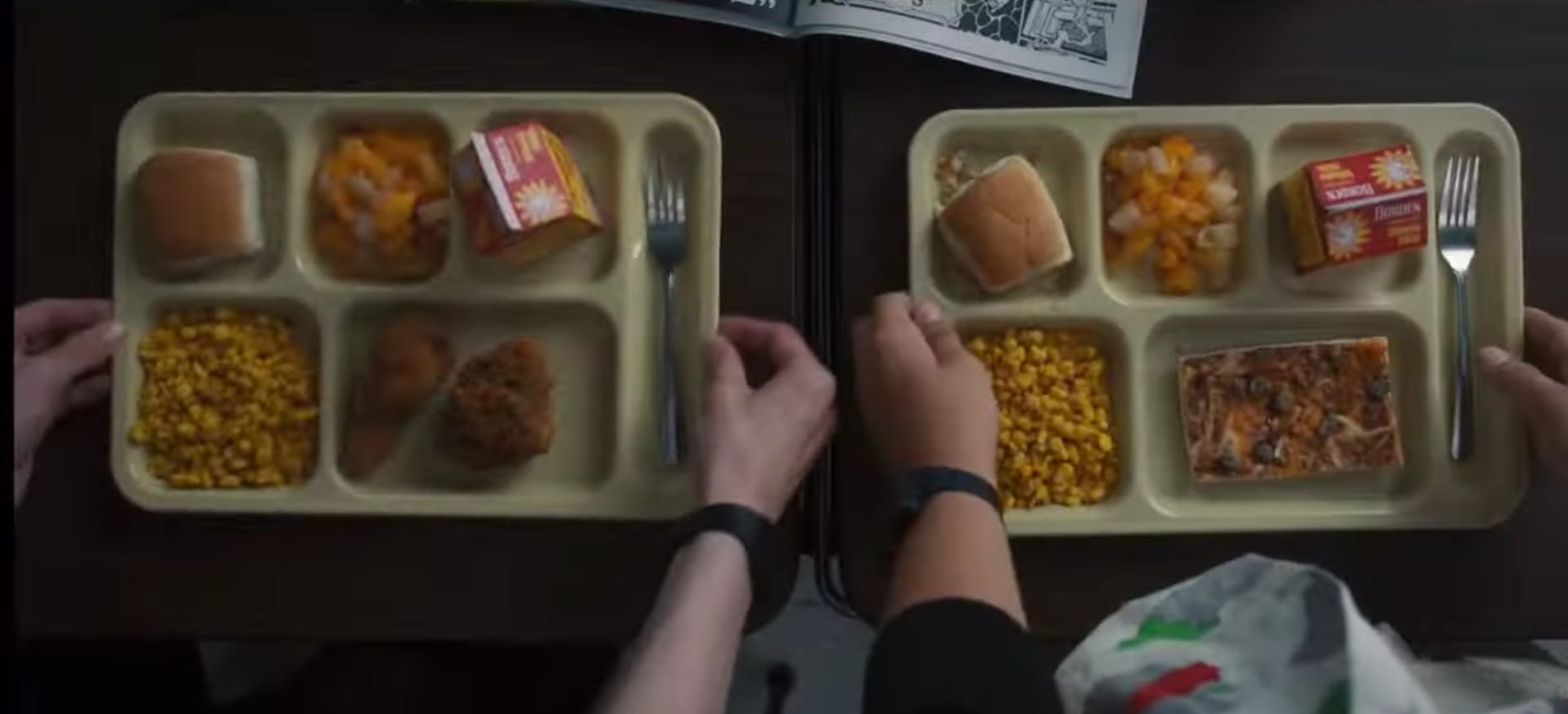 After that, we broke off into smaller groups for little shot and inserts. The next setup I was a part of was from Eddie’s introduction scene. Specifically just this insert shot of Mike and Dustin putting their lunch trays down on the table: